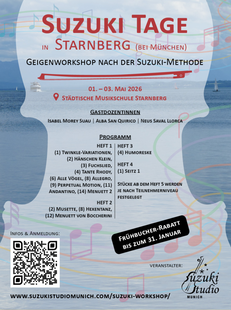 Das Suzuki Studio Munich unter Leitung von Rocío Rossi organisiert vom 01.-03. Mai 2026 einen Suzuki-Violinenworkshop. Folgende Aktivitäten sind geplant: Suzuki-Gruppenunterricht Body percussion mit Alex Penthin (Münchner Symphoniker) Elterngespräch Möglichkeit…