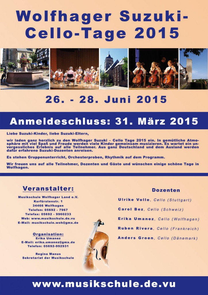 Herzliche Einladung an alle Cellisten! Anmeldeschluss ist der 31. März 2015. Nähere Informationen auch unter www.musikschule.de.vu ! Das Anmeldeformular können Sie hier abrufen: PDF / WORD